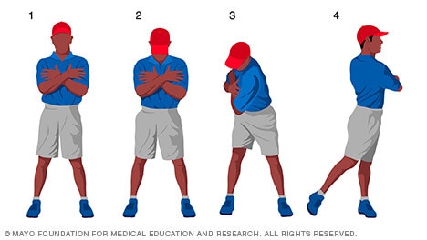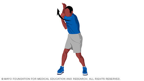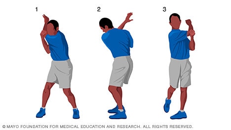 - To stretch your trailing shoulder — the right shoulder — grab your right elbow with your left hand. Then rotate your trunk to the left, as shown in image 3.