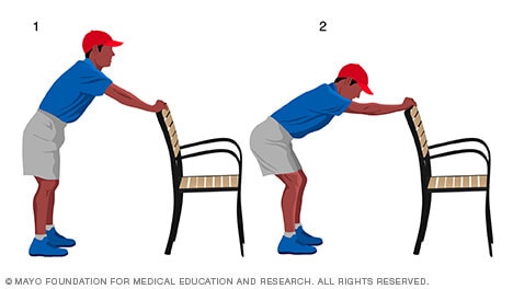 - Stand with your feet apart, facing the back of a chair or bench.