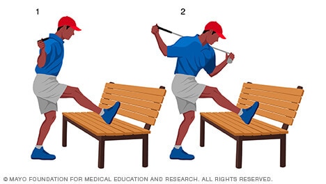 - Hold your golf club behind your shoulders. Stand next to a step, low table or bench. Put your right foot on the bench and bend your right knee slightly, as shown in image 1.