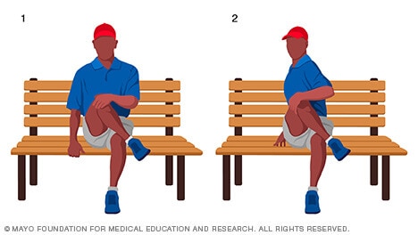 - Sit on a chair, low table or bench. Place your right ankle on top of your left thigh. Raise your right knee and grasp it with your left hand, as shown in image 1.