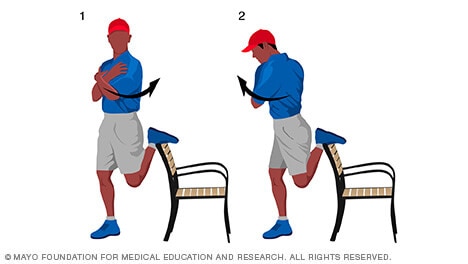 - Stand with your back to a chair or bench and cross your arms over your chest. Place your left foot on the bench, as shown in image 1. You can use a chair or bench with a lower seat than the one shown here.